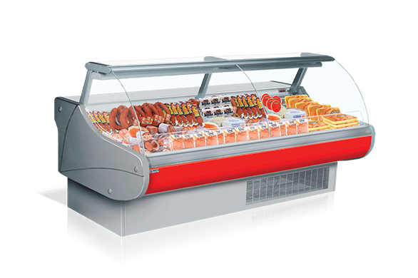 מקרר ויטרינה בעל מערכת קירור מובנית, תאורה פנימית, משטח אחסנה תחתון ואזור המיועד לעבודה עשוי נירוסטה