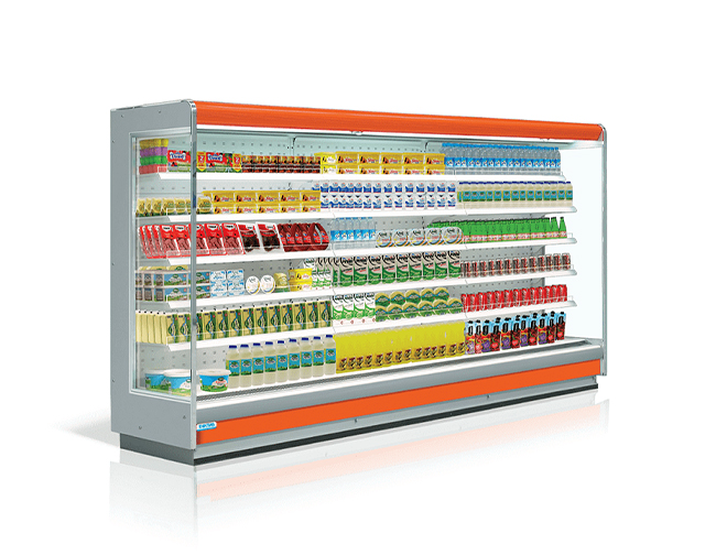 מקרר פתוח המיועד לתצוגה של מוצרי חלב ומשקאות