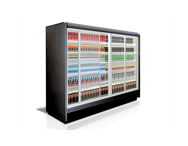 חלביה בעלת דלתות הזזה המתוכננת לתצוגה של מוצרי חלב, סלטים, ומשקאות